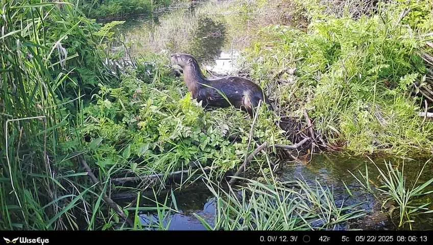 Otters have been photographed several times, they make occasional use the dam. It was very nice of one of them to pause on top of the dam in broad daylight and to strike a pose in profile. The movie shows that otter looking intently downstream and when hearing a sound, moving upstream and diving below the pond surface.